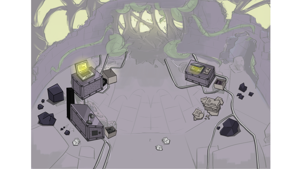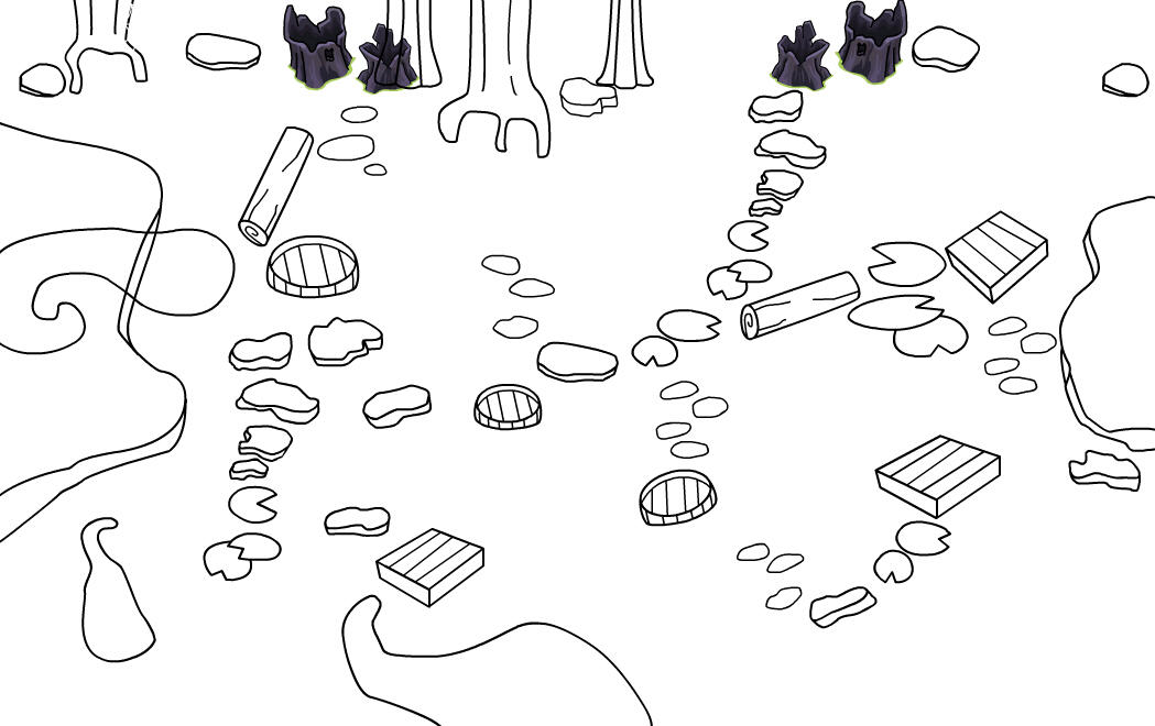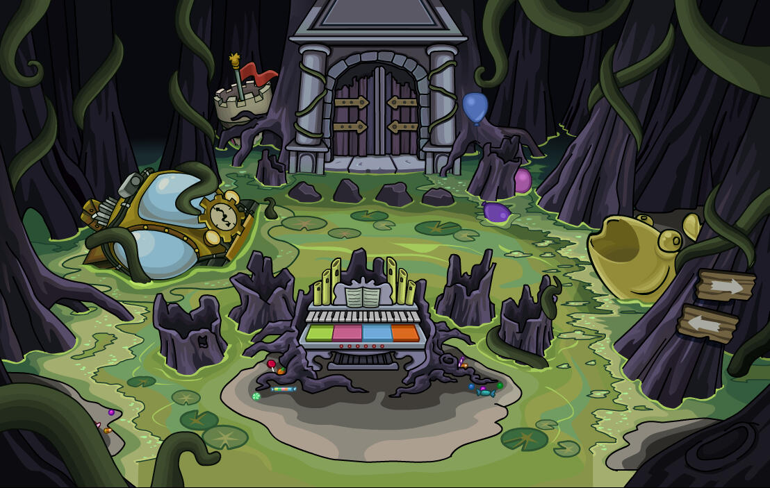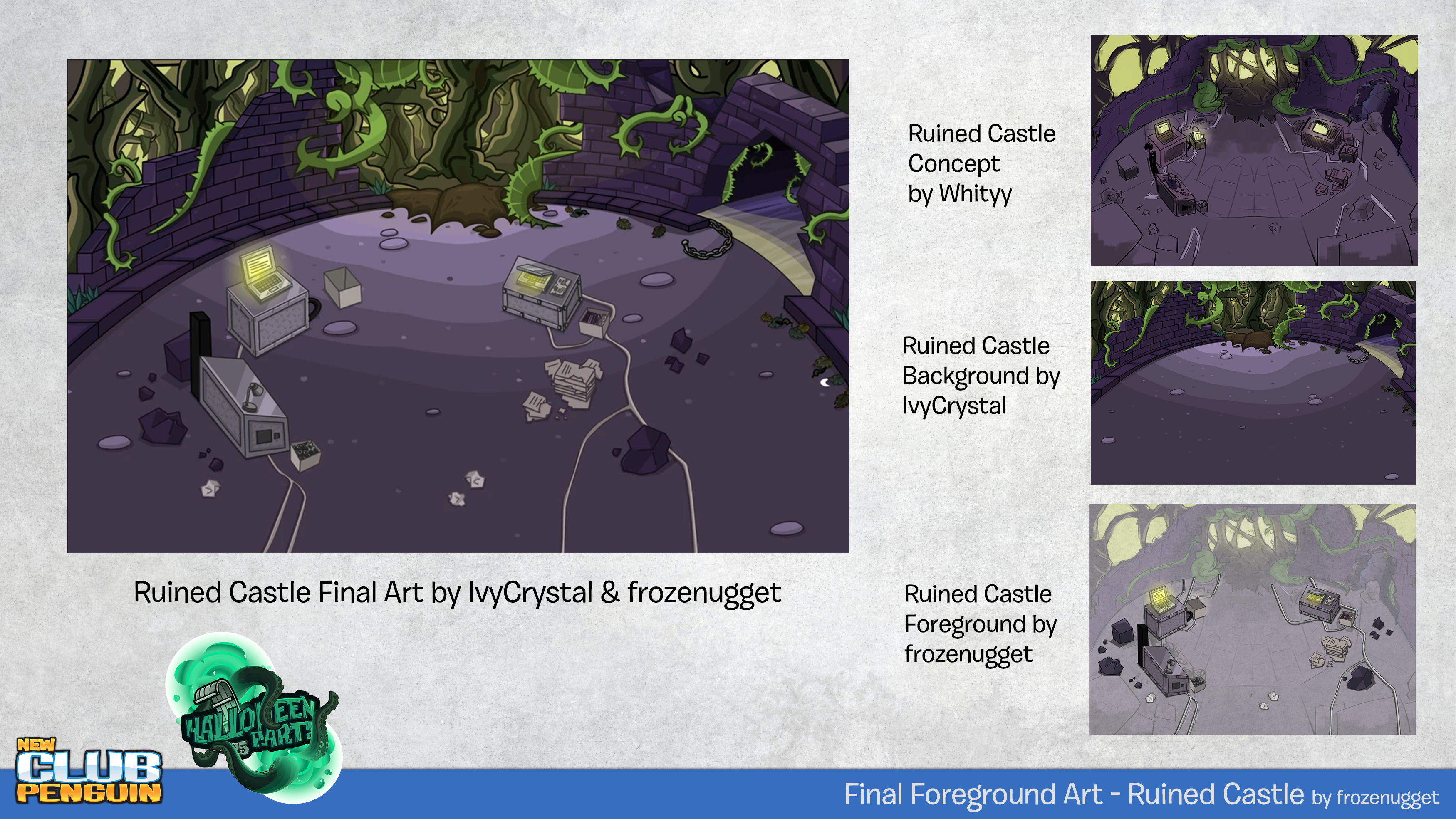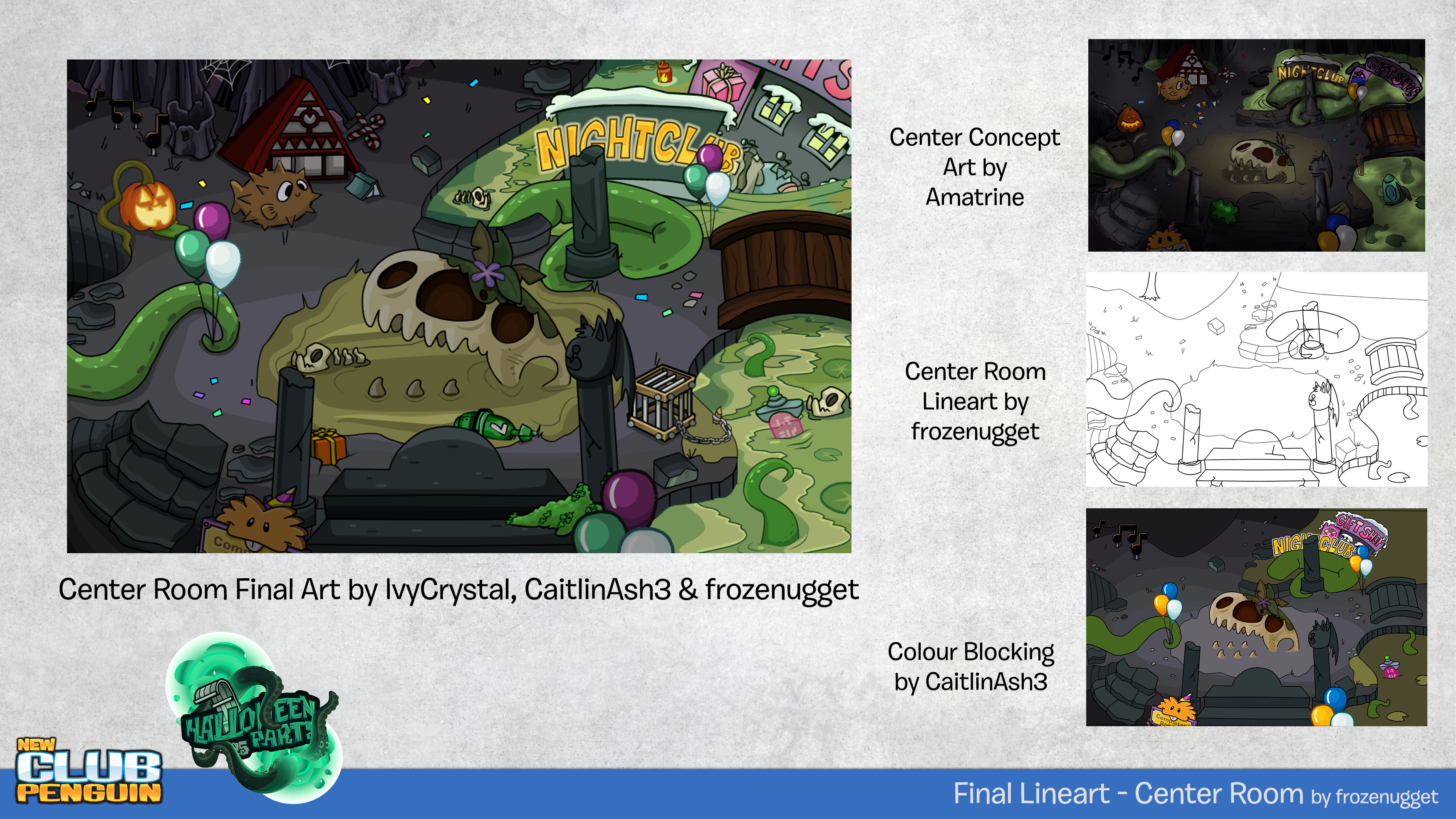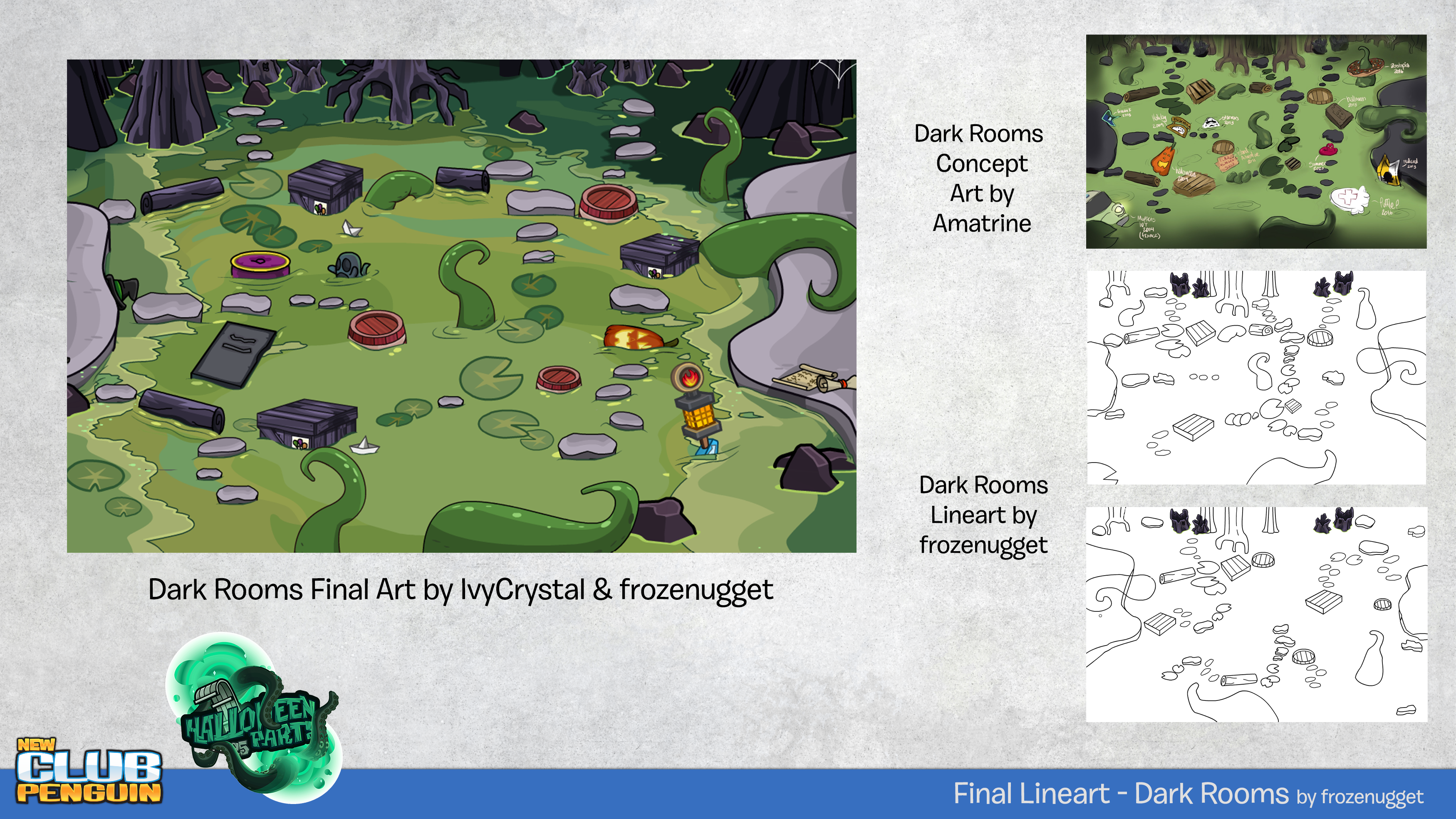 Halloween 2025 was my in game debut to the NCP staff.My second set of tasks involved turning concept art to final room art for the 2025 Halloween storyline. Every room was collaborative with other 2D artists to meet tight deadlines. I ended up working on foreground for the entrance, lineart for a few other rooms, and recolouring/reworking the "spooky swamp".